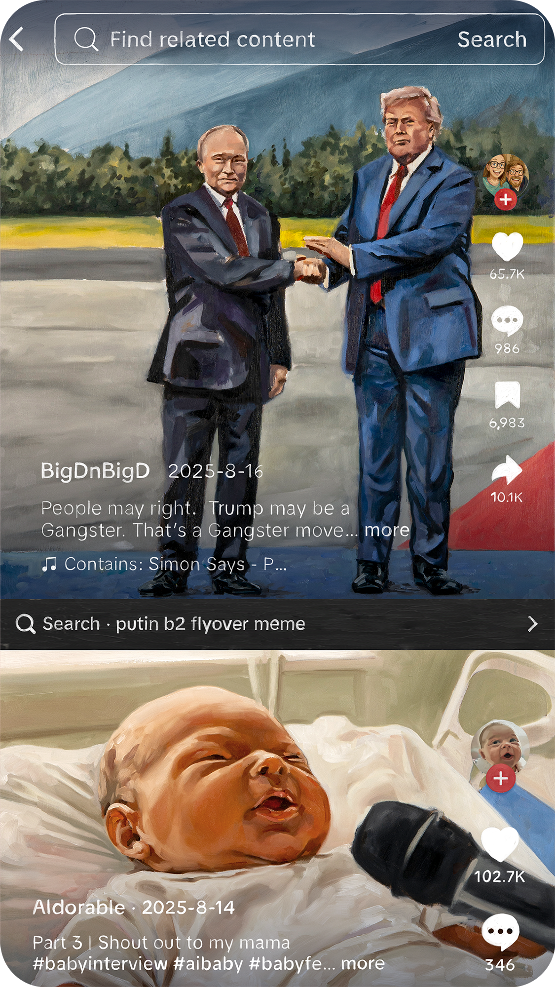Below, an AI-generated video shows a newborn baby giving an articulate interview about the state of society.